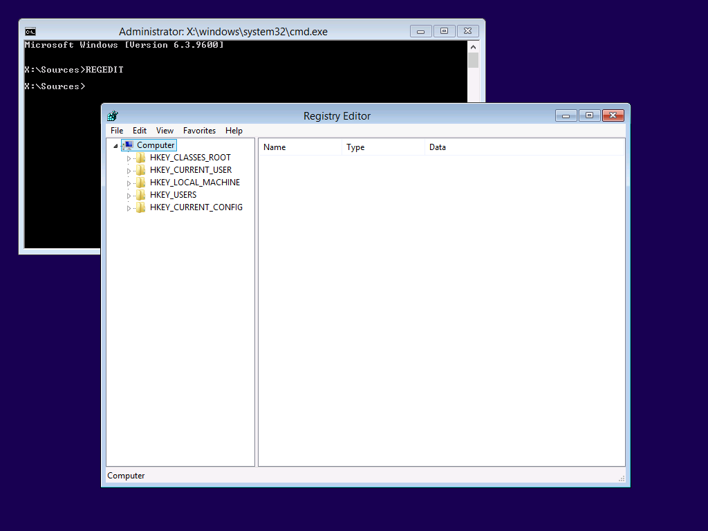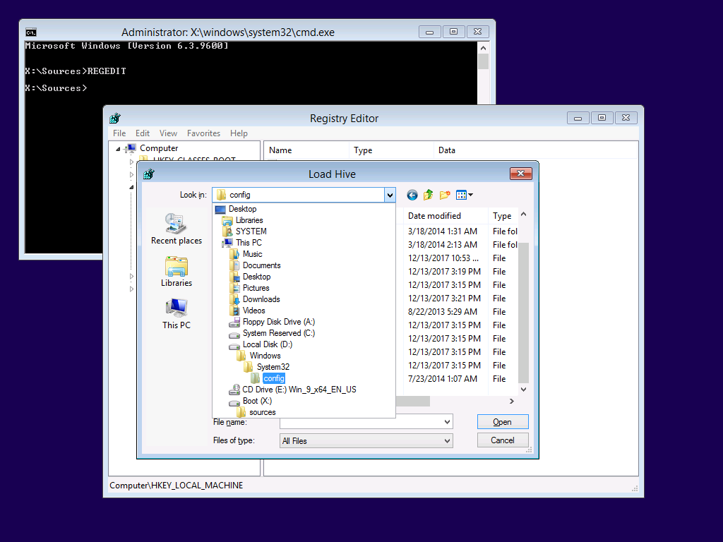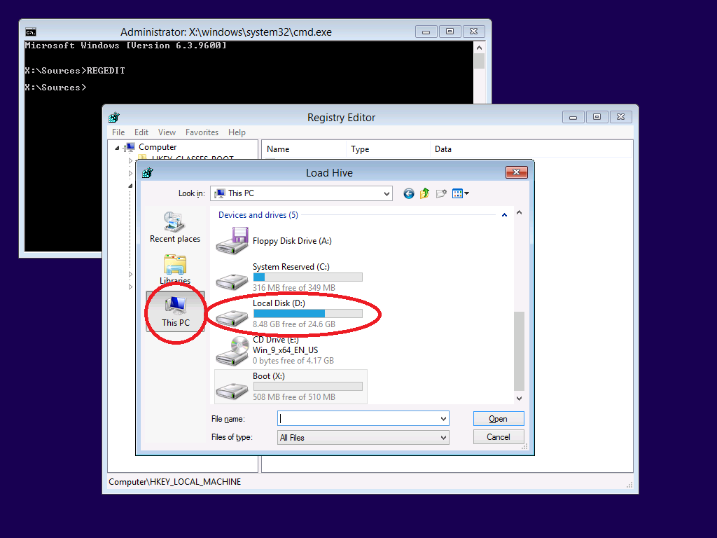 Step1: boot to any Windows 8 or newer installer or windows PE 5+ enviornment (the Win9 installer iso will also work):