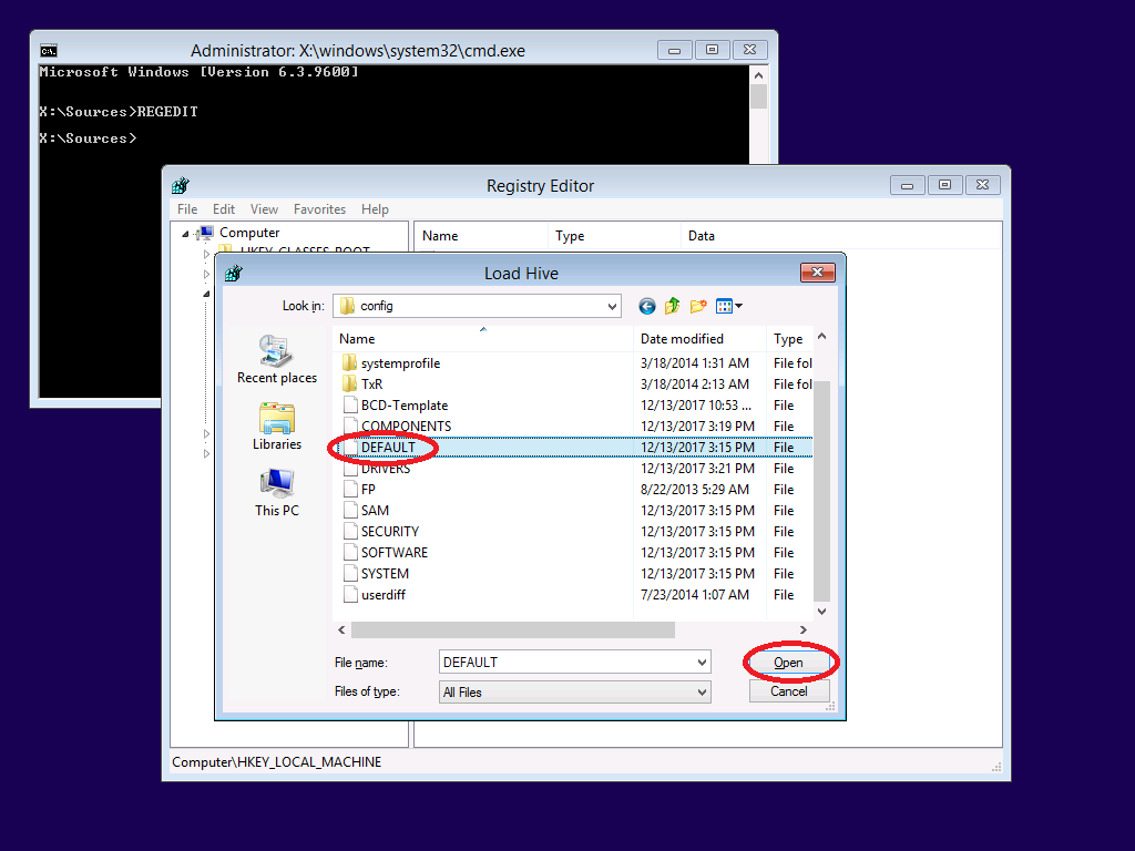 Step7: Open the file DEFAULT and name it DEFAULT-REPAIR/ (Your are not renaming any existing hives, you are mounting this new one with a new name)